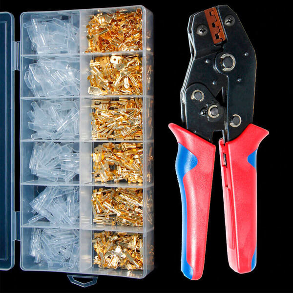 Комплектът включва мъжки и женски съединители в три размера (2,8, 4,8, 6,3 мм).